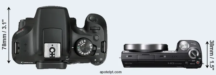 The physical size and weight of the Canon T6 and the Sony NEX-5N are illustrated in the side-by-side display below. The two cameras are presented according to their relative size. Three consecutive perspectives from the front, the top, and the back are available. All width, height and depth measures are rounded to the nearest millimeter.