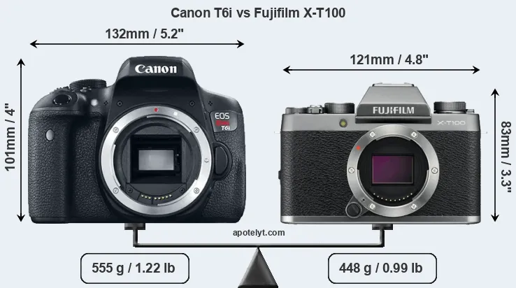 The side-by-side display below illustrates the physical size and weight of the Canon T6i and the Fujifilm X-T100. The two cameras are presented according to their relative size. Three consecutive perspectives from the front, the top, and the back are available. All size dimensions are rounded to the nearest millimeter.