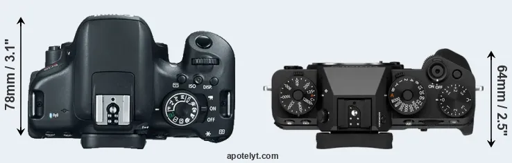 The side-by-side display below illustrates the physical size and weight of the Canon T6i and the Fujifilm X-T5. The two cameras are presented according to their relative size. Three successive views from the front, the top, and the rear are shown. All size dimensions are rounded to the nearest millimeter.