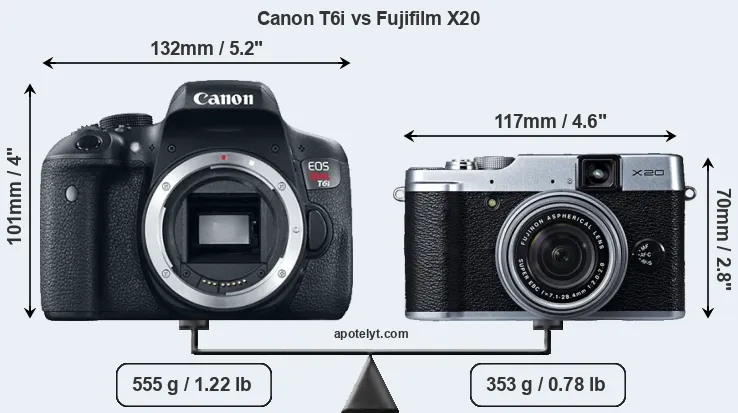 The physical size and weight of the Canon T6i and the Fujifilm X20 are illustrated in the side-by-side display below. The two cameras are presented according to their relative size. Three successive views from the front, the top, and the rear are shown. All size dimensions are rounded to the nearest millimeter.
