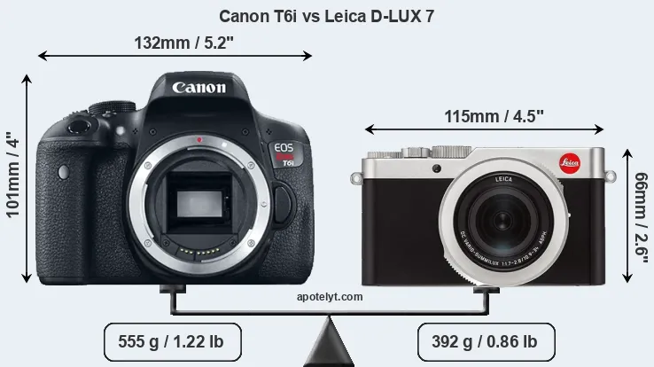 The side-by-side display below illustrates the physical size and weight of the Canon T6i and the Leica D-LUX 7. The two cameras are presented according to their relative size. Three consecutive perspectives from the front, the top, and the back are available. All width, height and depth measures are rounded to the nearest millimeter.