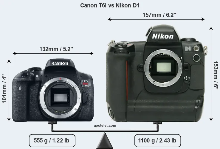 The physical size and weight of the Canon T6i and the Nikon D1 are illustrated in the side-by-side display below. The two cameras are presented according to their relative size. Three consecutive views from the front, the top, and the rear side are shown. All width, height and depth measures are rounded to the nearest millimeter.