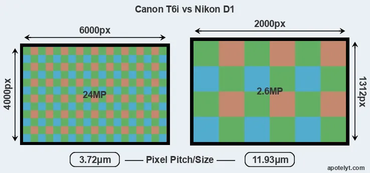 Despite having a smaller sensor, the Canon T6i offers a higher resolution of 24 megapixels, compared with 2.6 MP of the Nikon D1. This megapixels advantage comes at the cost of a higher pixel density and a smaller size of the individual pixel (with a pixel pitch of 3.72μm versus 11.93μm for the D1). However, it should be noted that the T6i is much more recent (by 15 years and 7 months) than the D1, and its sensor will have benefitted from technological advances during this time that make it possible to gather light more efficiently.
