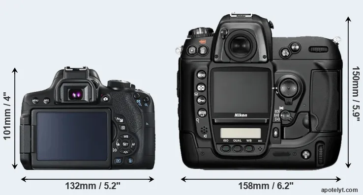 The side-by-side display below illustrates the physical size and weight of the Canon T6i and the Nikon D2H. The two cameras are presented according to their relative size. Three consecutive perspectives from the front, the top, and the back are available. All width, height and depth measures are rounded to the nearest millimeter.
