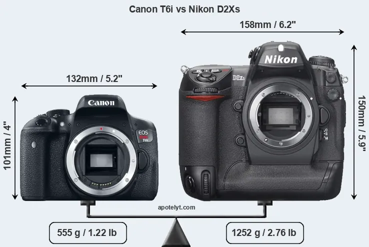 If the front view area (width x height) of the cameras is taken as an aggregate measure of their size, the Nikon D2Xs is considerably larger (78 percent) than the Canon T6i. Moreover, the D2Xs is substantially heavier (126 percent) than the T6i. It is noteworthy in this context that the D2Xs is splash and dust-proof, while the T6i does not feature any corresponding weather-sealing.