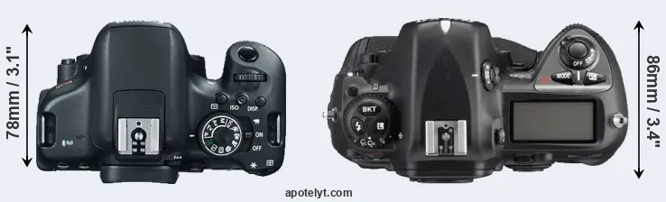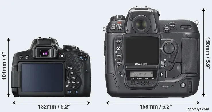 The physical size and weight of the Canon T6i and the Nikon D2Xs are illustrated in the side-by-side display below. The two cameras are presented according to their relative size. Three successive views from the front, the top, and the rear are shown. All size dimensions are rounded to the nearest millimeter.