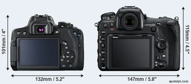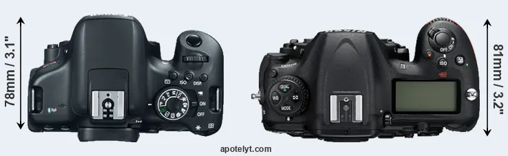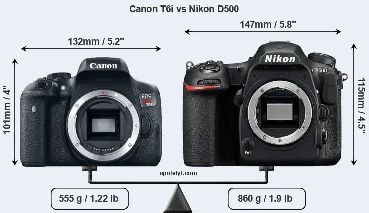 The physical size and weight of the Canon T6i and the Nikon D500 are illustrated in the side-by-side display below. The two cameras are presented according to their relative size. Three consecutive perspectives from the front, the top, and the back are available. All width, height and depth measures are rounded to the nearest millimeter.