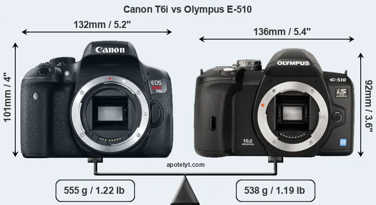 The physical size and weight of the Canon T6i and the Olympus E-510 are illustrated in the side-by-side display below. The two cameras are presented according to their relative size. Three successive views from the front, the top, and the rear are shown. All size dimensions are rounded to the nearest millimeter.