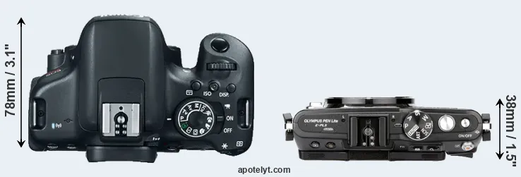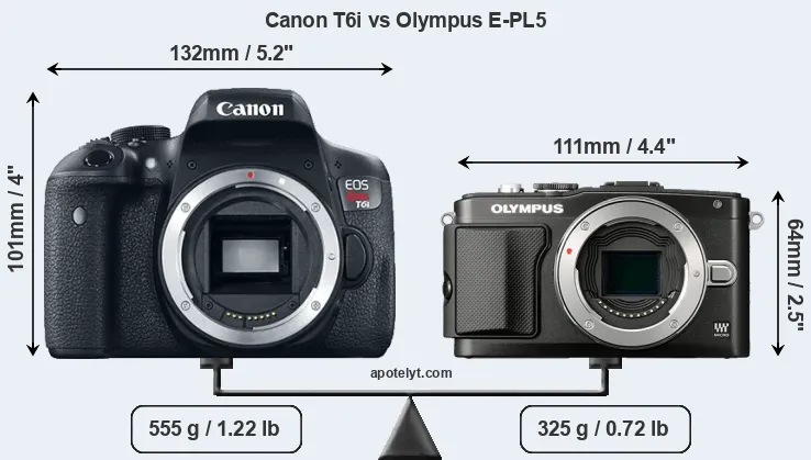 The physical size and weight of the Canon T6i and the Olympus E-PL5 are illustrated in the side-by-side display below. The two cameras are presented according to their relative size. Three consecutive perspectives from the front, the top, and the back are available. All width, height and depth dimensions are rounded to the nearest millimeter.