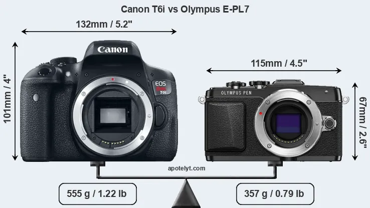 The side-by-side display below illustrates the physical size and weight of the Canon T6i and the Olympus E-PL7. The two cameras are presented according to their relative size. Three consecutive perspectives from the front, the top, and the back are available. All width, height and depth dimensions are rounded to the nearest millimeter.