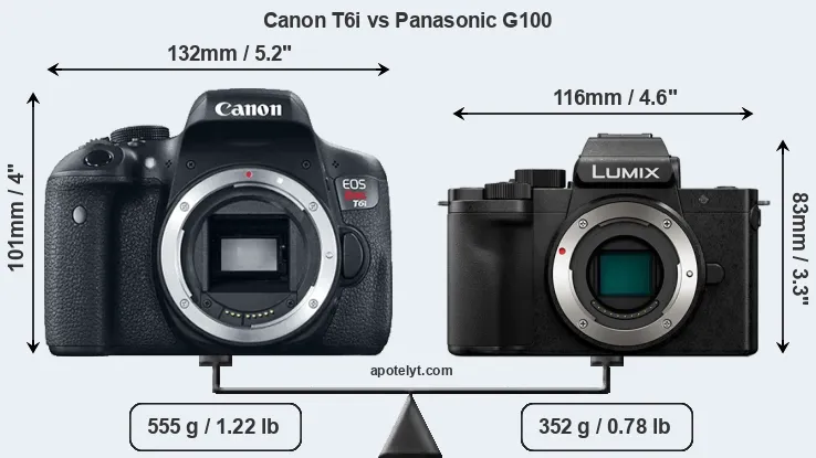 An illustration of the physical size and weight of the Canon T6i and the Panasonic G100 is provided in the side-by-side display below. The two cameras are presented according to their relative size. Three successive views from the front, the top, and the rear are shown. All width, height and depth dimensions are rounded to the nearest millimeter.