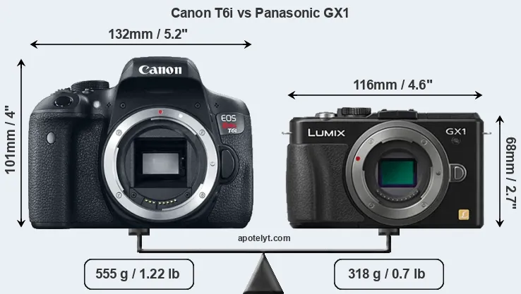 An illustration of the physical size and weight of the Canon T6i and the Panasonic GX1 is provided in the side-by-side display below. The two cameras are presented according to their relative size. Three successive views from the front, the top, and the rear are shown. All width, height and depth dimensions are rounded to the nearest millimeter.