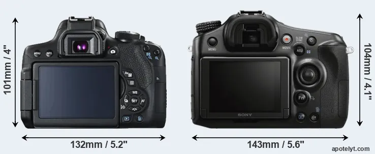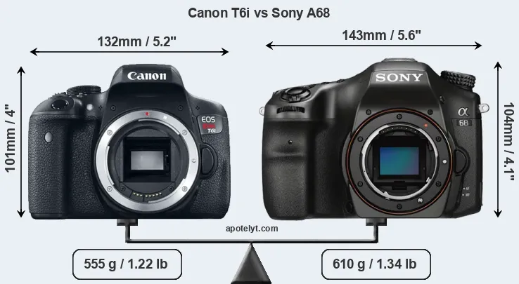 The physical size and weight of the Canon T6i and the Sony A68 are illustrated in the side-by-side display below. The two cameras are presented according to their relative size. Three successive views from the front, the top, and the rear are shown. All width, height and depth measures are rounded to the nearest millimeter.
