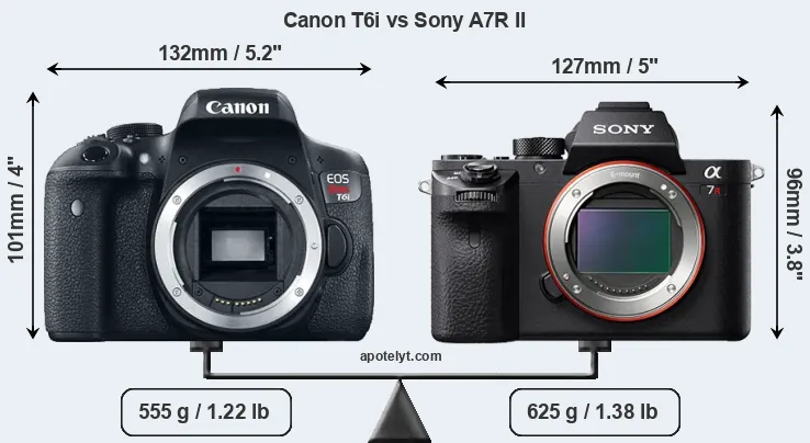 The side-by-side display below illustrates the physical size and weight of the Canon T6i and the Sony A7R II. The two cameras are presented according to their relative size. Three successive views from the front, the top, and the rear are shown. All width, height and depth measures are rounded to the nearest millimeter.