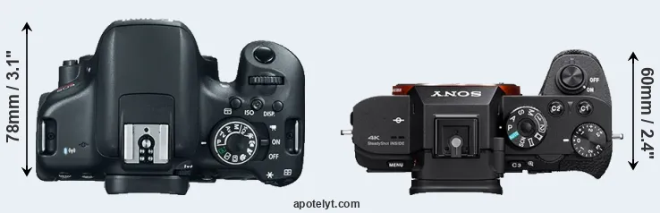 The physical size and weight of the Canon T6i and the Sony A7S II are illustrated in the side-by-side display below. The two cameras are presented according to their relative size. Three successive views from the front, the top, and the rear are shown. All width, height and depth dimensions are rounded to the nearest millimeter.
