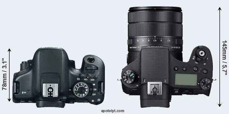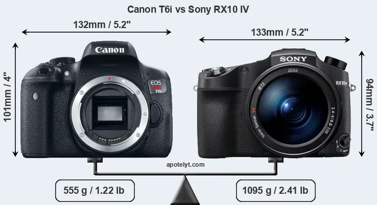 An illustration of the physical size and weight of the Canon T6i and the Sony RX10 IV is provided in the side-by-side display below. The two cameras are presented according to their relative size. Three consecutive views from the front, the top, and the rear side are shown. All width, height and depth measures are rounded to the nearest millimeter.