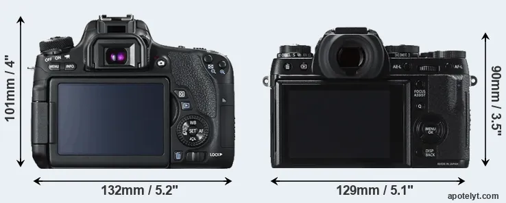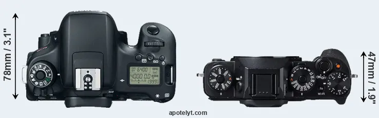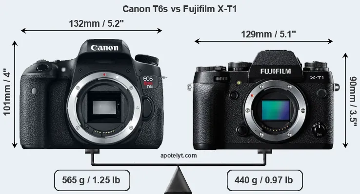 The side-by-side display below illustrates the physical size and weight of the Canon T6s and the Fujifilm X-T1. The two cameras are presented according to their relative size. Three consecutive perspectives from the front, the top, and the back are available. All width, height and depth dimensions are rounded to the nearest millimeter.