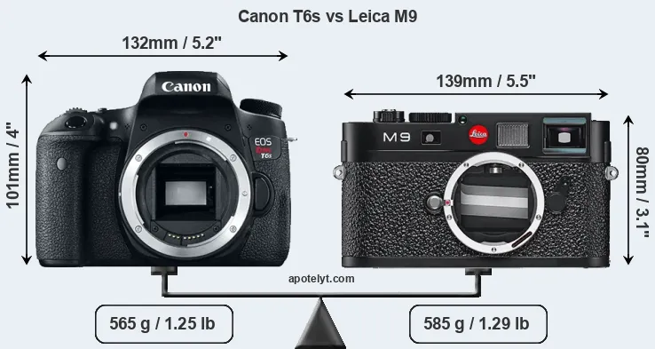 An illustration of the physical size and weight of the Canon T6s and the Leica M9 is provided in the side-by-side display below. The two cameras are presented according to their relative size. Three successive views from the front, the top, and the rear are shown. All width, height and depth dimensions are rounded to the nearest millimeter.