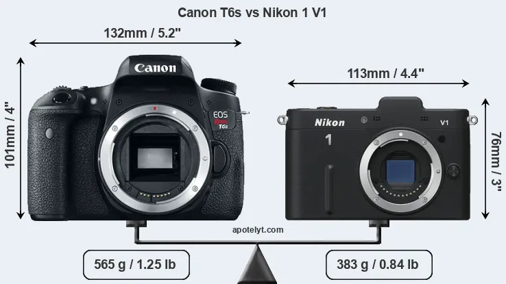 The side-by-side display below illustrates the physical size and weight of the Canon T6s and the Nikon 1 V1. The two cameras are presented according to their relative size. Three successive views from the front, the top, and the rear are shown. All size dimensions are rounded to the nearest millimeter.