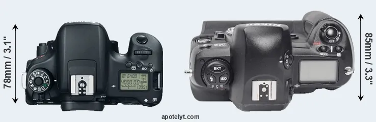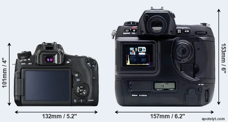 The physical size and weight of the Canon T6s and the Nikon D1X are illustrated in the side-by-side display below. The two cameras are presented according to their relative size. Three successive views from the front, the top, and the rear are shown. All width, height and depth measures are rounded to the nearest millimeter.