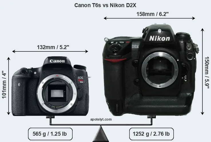 If the front view area (width x height) of the cameras is taken as an aggregate measure of their size, the Nikon D2X is considerably larger (78 percent) than the Canon T6s. Moreover, the D2X is substantially heavier (122 percent) than the T6s. It is noteworthy in this context that the D2X is splash and dust-proof, while the T6s does not feature any corresponding weather-sealing.