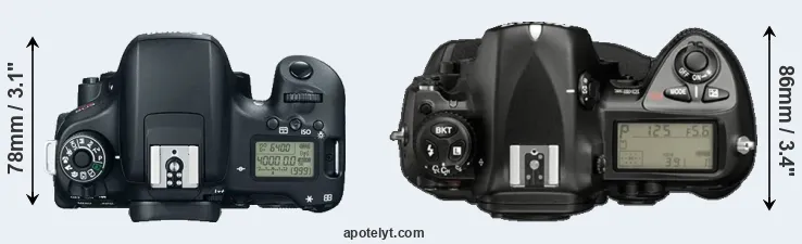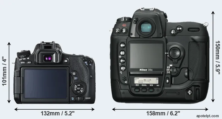 The physical size and weight of the Canon T6s and the Nikon D2X are illustrated in the side-by-side display below. The two cameras are presented according to their relative size. Three successive views from the front, the top, and the rear are shown. All size dimensions are rounded to the nearest millimeter.