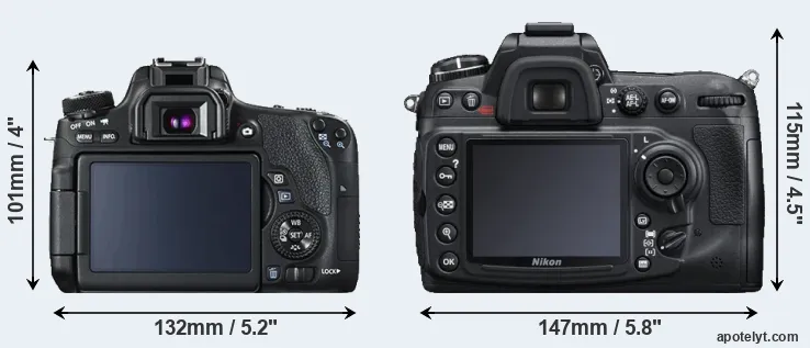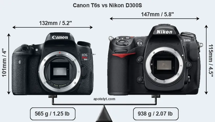 The side-by-side display below illustrates the physical size and weight of the Canon T6s and the Nikon D300S. The two cameras are presented according to their relative size. Three consecutive views from the front, the top, and the rear side are shown. All width, height and depth measures are rounded to the nearest millimeter.
