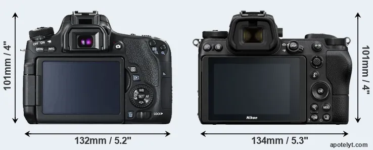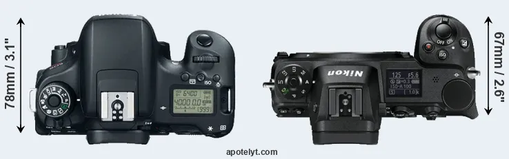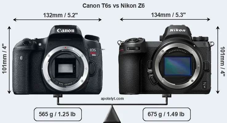 The physical size and weight of the Canon T6s and the Nikon Z6 are illustrated in the side-by-side display below. The two cameras are presented according to their relative size. Three consecutive views from the front, the top, and the rear side are shown. All width, height and depth dimensions are rounded to the nearest millimeter.