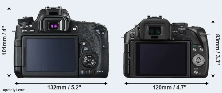 The side-by-side display below illustrates the physical size and weight of the Canon T6s and the Panasonic G5. The two cameras are presented according to their relative size. Three consecutive views from the front, the top, and the rear side are shown. All width, height and depth dimensions are rounded to the nearest millimeter.