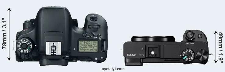 An illustration of the physical size and weight of the Canon T6s and the Sony A6300 is provided in the side-by-side display below. The two cameras are presented according to their relative size. Three consecutive views from the front, the top, and the rear side are shown. All width, height and depth dimensions are rounded to the nearest millimeter.