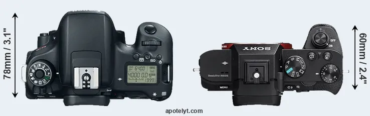 The side-by-side display below illustrates the physical size and weight of the Canon T6s and the Sony A7 II. The two cameras are presented according to their relative size. Three consecutive views from the front, the top, and the rear side are shown. All size dimensions are rounded to the nearest millimeter.