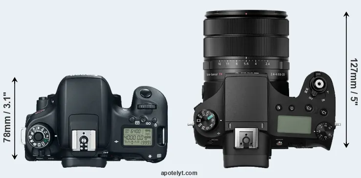 An illustration of the physical size and weight of the Canon T6s and the Sony RX10 III is provided in the side-by-side display below. The two cameras are presented according to their relative size. Three consecutive views from the front, the top, and the rear side are shown. All width, height and depth measures are rounded to the nearest millimeter.