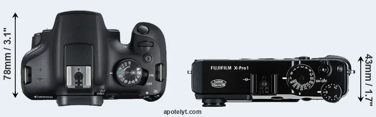 The side-by-side display below illustrates the physical size and weight of the Canon T7 and the Fujifilm X-Pro1. The two cameras are presented according to their relative size. Three consecutive perspectives from the front, the top, and the back are available. All width, height and depth measures are rounded to the nearest millimeter.