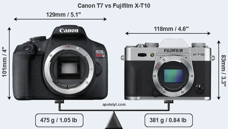 The physical size and weight of the Canon T7 and the Fujifilm X-T10 are illustrated in the side-by-side display below. The two cameras are presented according to their relative size. Three consecutive views from the front, the top, and the rear side are shown. All width, height and depth dimensions are rounded to the nearest millimeter.