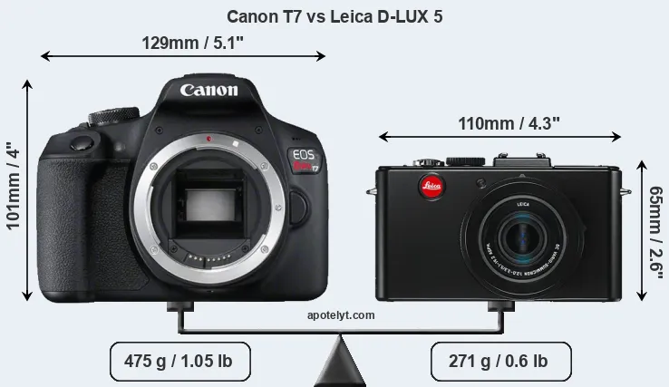 An illustration of the physical size and weight of the Canon T7 and the Leica D-LUX 5 is provided in the side-by-side display below. The two cameras are presented according to their relative size. Three consecutive perspectives from the front, the top, and the back are available. All width, height and depth measures are rounded to the nearest millimeter.