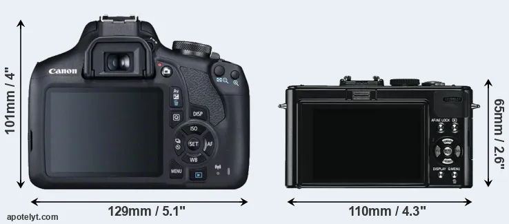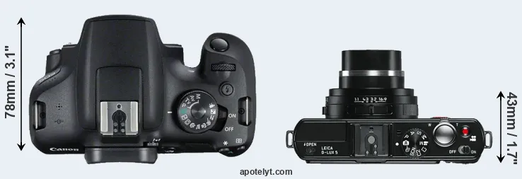 The above size and weight comparisons are to some extent incomplete and possibly misleading, as the D-LUX 5 has a lens built in, whereas the T7 is an interchangeable lens camera that requires a separate lens. Attaching the latter will add extra weight and bulk to the setup. You can compare the optics available for the T7 and their specifications in the Canon EF Lens Catalog.
