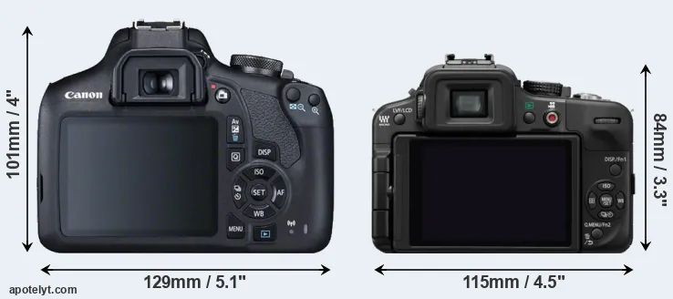 The side-by-side display below illustrates the physical size and weight of the Canon T7 and the Panasonic G3. The two cameras are presented according to their relative size. Three consecutive perspectives from the front, the top, and the back are available. All width, height and depth measures are rounded to the nearest millimeter.