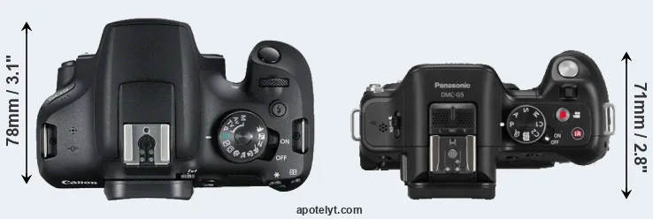 The physical size and weight of the Canon T7 and the Panasonic G5 are illustrated in the side-by-side display below. The two cameras are presented according to their relative size. Three successive views from the front, the top, and the rear are shown. All size dimensions are rounded to the nearest millimeter.