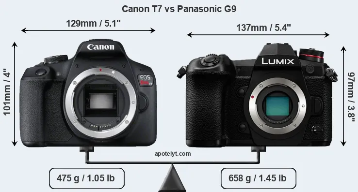 If the front view area (width x height) of the cameras is taken as an aggregate measure of their size, the Panasonic G9 is somewhat larger (2 percent) than the Canon T7. Moreover, the G9 is substantially heavier (39 percent) than the T7. It is noteworthy in this context that the G9 is splash and dust-proof, while the T7 does not feature any corresponding weather-sealing.