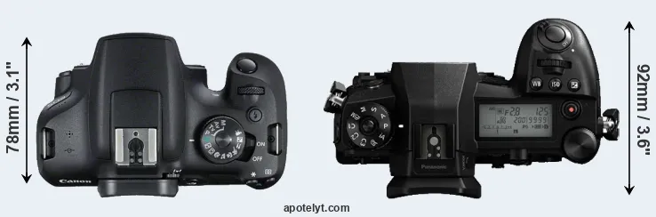 The side-by-side display below illustrates the physical size and weight of the Canon T7 and the Panasonic G9. The two cameras are presented according to their relative size. Three consecutive views from the front, the top, and the rear side are shown. All size dimensions are rounded to the nearest millimeter.