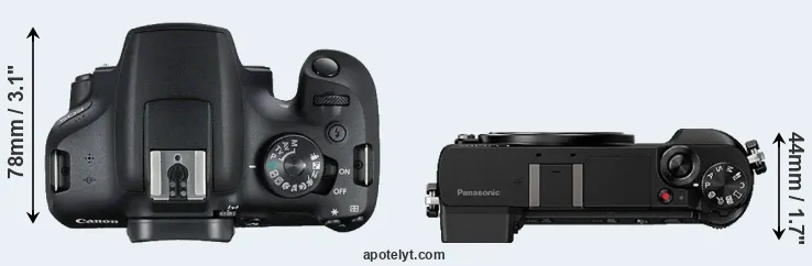 An illustration of the physical size and weight of the Canon T7 and the Panasonic GX85 is provided in the side-by-side display below. The two cameras are presented according to their relative size. Three successive views from the front, the top, and the rear are shown. All size dimensions are rounded to the nearest millimeter.