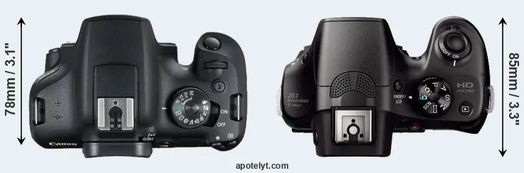 The side-by-side display below illustrates the physical size and weight of the Canon T7 and the Sony A3000. The two cameras are presented according to their relative size. Three successive views from the front, the top, and the rear are shown. All size dimensions are rounded to the nearest millimeter.