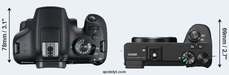 The side-by-side display below illustrates the physical size and weight of the Canon T7 and the Sony A6600. The two cameras are presented according to their relative size. Three consecutive perspectives from the front, the top, and the back are available. All width, height and depth measures are rounded to the nearest millimeter.