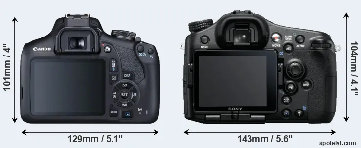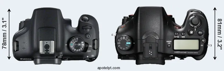 The side-by-side display below illustrates the physical size and weight of the Canon T7 and the Sony A77. The two cameras are presented according to their relative size. Three successive views from the front, the top, and the rear are shown. All width, height and depth dimensions are rounded to the nearest millimeter.