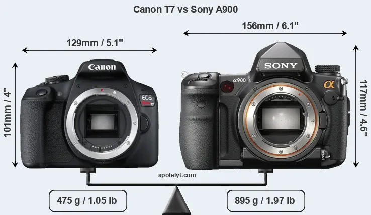 An illustration of the physical size and weight of the Canon T7 and the Sony A900 is provided in the side-by-side display below. The two cameras are presented according to their relative size. Three successive views from the front, the top, and the rear are shown. All width, height and depth measures are rounded to the nearest millimeter.