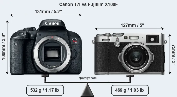 The side-by-side display below illustrates the physical size and weight of the Canon T7i and the Fujifilm X100F. The two cameras are presented according to their relative size. Three successive views from the front, the top, and the rear are shown. All size dimensions are rounded to the nearest millimeter.
