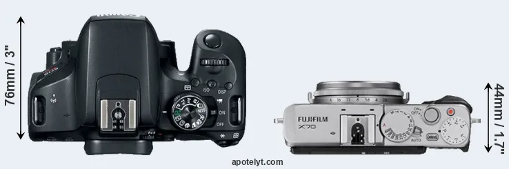 An illustration of the physical size and weight of the Canon T7i and the Fujifilm X70 is provided in the side-by-side display below. The two cameras are presented according to their relative size. Three successive views from the front, the top, and the rear are shown. All size dimensions are rounded to the nearest millimeter.