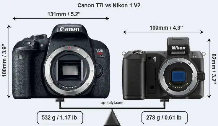 The physical size and weight of the Canon T7i and the Nikon 1 V2 are illustrated in the side-by-side display below. The two cameras are presented according to their relative size. Three successive views from the front, the top, and the rear are shown. All width, height and depth measures are rounded to the nearest millimeter.