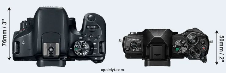 The side-by-side display below illustrates the physical size and weight of the Canon T7i and the Olympus E-M10 III. The two cameras are presented according to their relative size. Three successive views from the front, the top, and the rear are shown. All width, height and depth dimensions are rounded to the nearest millimeter.