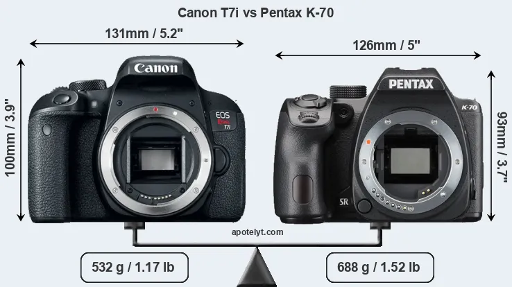 An illustration of the physical size and weight of the Canon T7i and the Pentax K-70 is provided in the side-by-side display below. The two cameras are presented according to their relative size. Three consecutive views from the front, the top, and the rear side are shown. All size dimensions are rounded to the nearest millimeter.